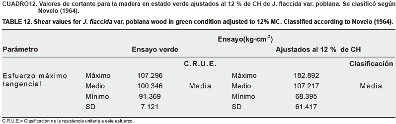 Según las propiedades mecánicas, la madera de J. flaccida var. poblana no es apta para uso estructural, por la baja resistencia que presenta ante los diferentes esfuerzos.