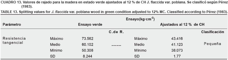 Este ensayo es un indicador de la resistencia de la madera de J. flaccida var. poblana a hendirse como consecuencia de la introducción de clavos o tornillos en su interior. Los resultados del Cuadro 13 muestran que el esfuerzo máximo de rajado tanto en condición seca como verde, indica que la resistencia de esta madera es pequeña, o sea que se raja muy fácilmente. Esta característica es favorable para la obtención de leña en raja, pero en la elaboración de muebles se debe tener cuidado al unir partes con clavos o tornillos, ya que esta propiedad se ve influida favorablemente por la densidad básica media e hilo recto de la madera.