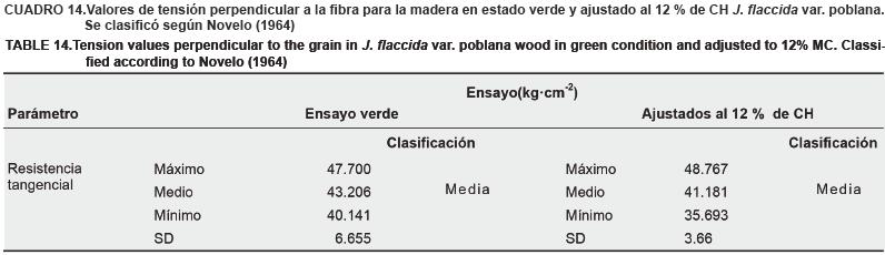 La resistencia de la madera de J. flaccida var. poblana a este tipo de esfuerzo en dirección radial, es la más baja de todas las resistencias y se determinó midiendo el esfuerzo necesario para producir la ruptura en la madera (Cuadro 14).