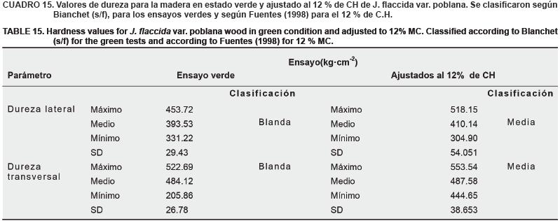 Esta propiedad es muy importante si se va a utilizar la madera para la elaboración de pisos, cubiertas de mesa, plataformas y superficies con resistencia al desgaste mecánico (Fuentes, 1998). Se puede observar que en la madera de J. flaccida var. poblana, al disminuir el contenido de humedad, la dureza lateral se incrementa (Cuadro 15). Esto se debe a que la madera se vuelve más rígida al perder humedad. Por esta razón, se recomienda el uso de la madera de J. flaccida var. poblana en cortes laterales cuando va a estar sometida a este esfuerzo.