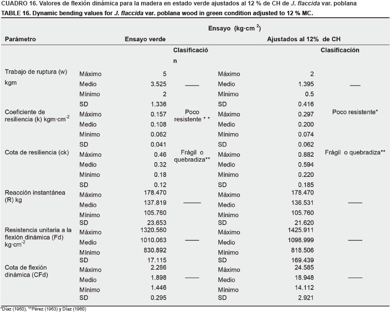 Los valores de resistencia al impacto para la madera de J. flaccida var. poblana tanto en estado verde como al 12 % de CH, son bajos, por lo que la madera es poco resiliente (Cuadro 16). Esto significa que tiene baja capacidad para absorber energía, y por ello no se recomienda su uso para elementos de madera de artículos deportivos y mangos de herramienta sujetos a esfuerzos de impacto. La cota dinámica o cota de resiliencia (ck) para esta madera se clasifica como frágil o quebradiza; esto indica que la madera de J. flaccida var. poblana es impropia para usos móviles.