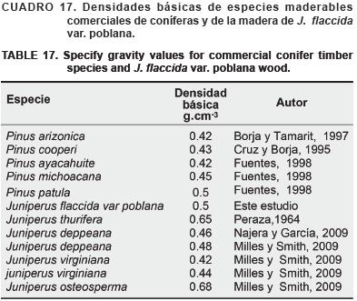El Cuadro 17 muestra la densidad básica de la madera de Juniperus flaccida var. poblana, en comparación con otras especies de importancia comercial. La densidad básica es la más importante para caracterizar una madera porque es el reflejo de la cantidad de pared celular por unidad de volumen que presenta una madera (Fuentes, 1998). Este parámetro es importante en la flexión y en la compresión de la madera y también es primordial en la formación de tableros para saber qué cantidad de madera se necesita utilizar en un tablero de determinada densidad. Por ejemplo, en los tableros contrachapados, una chapa de madera de densidad baja necesita bastante adhesivo porque absorbe poco y la línea de pegamento es muy delgada.