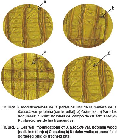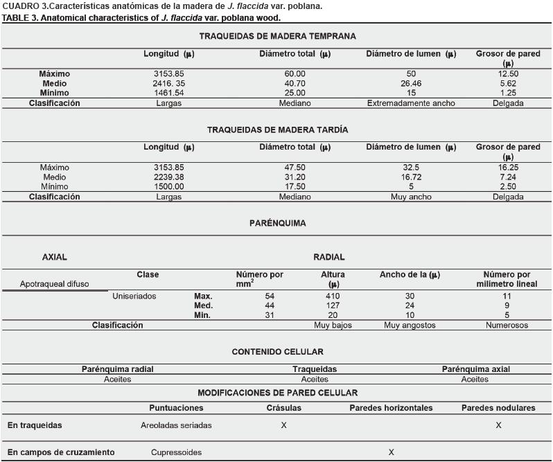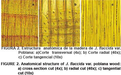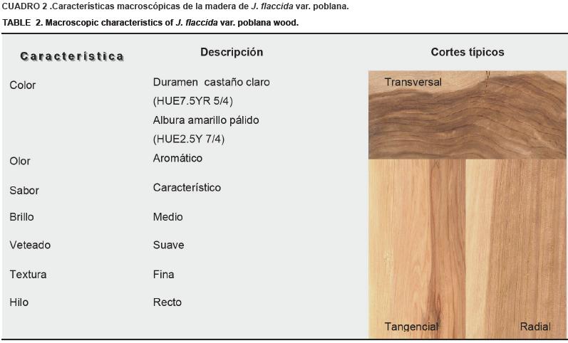 En el Cuadro 2 se presentan las características macroscópicas y los cortes transversal, tangencial y radial de J. flaccida var. poblana.