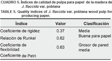 En la Cuadro 5, se observan los índices de calidad de pulpa de la madera de J. flaccida var. poblana.
