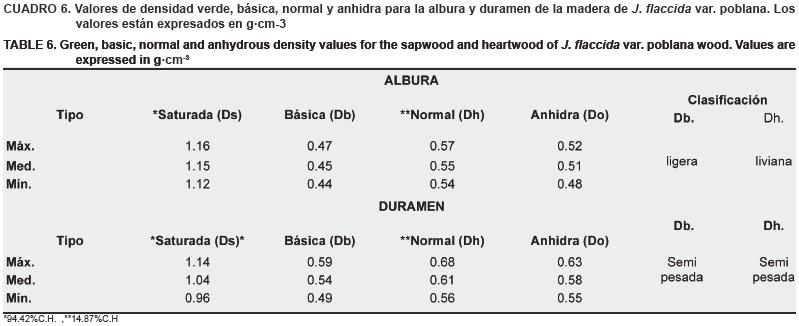 La densidad básica es el parámetro más utilizado como índice de comparación entre las diferentes especies de maderas; es importante en la determinación de las propiedades físicas y mecánicas (Fuentes, 1998). Las diferentes densidades de la madera de J. flaccida var. poblana se muestran en el Cuadro 6.