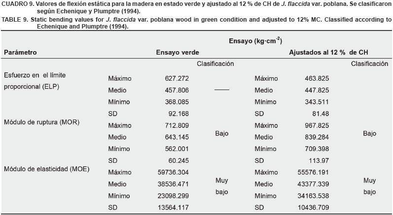 El valor obtenido para esta prueba tiene su aplicación si la madera se va a usar de manera estructural, sobre todo para vigas (Fuentes, 1998). Los resultados obtenidos para la madera de J. flaccida var. poblana en condición seca indican que los esfuerzos al límite proporcional y módulo de elasticidad son bajos. De acuerdo a Echenique y Plumptre (1994), los límites de propiedades de elementos estructurales para techos, muros y pisos son: MOR de 400 a 1,350 kgcm2, MOE de 71,000 a 150,000 kgcm2. Por lo tanto, la madera de J. flaccida var. poblana no es recomendable para este uso (Cuadro 9).
