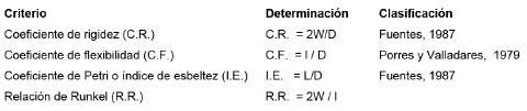 Con los datos de longitud, diámetros de lumen, diámetro total y grosor de pared de las traqueidas se calcularon los siguientes coeficientes: