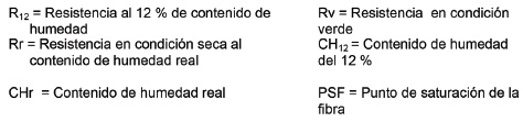 Ajuste de los valores de resistencia. Debido a que el contenido de humedad en condición seca fue de 15.69 %, se realizó un ajuste en los valores de resistencia utilizando la siguiente expresión Dinwoodie (2000):