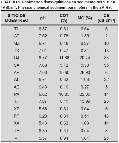 En el Cuadro 1, se observa que el 75 % de los sedimentos revelaron porcentajes bajos de materia orgánica y carbono orgánico total. Los niveles de MO fluctuaron entre 0.27 y 5.38 %, valores típicos de sedimentos arenosos y ambientes hidrodinámicos. Llama la atención los sitios identificados como El Ojito (20.44 %), Apizaco (26.90 %), Panotla (29.95 %) y Tetlatlahuca (13.99%) con porcentajes sumamente elevados.