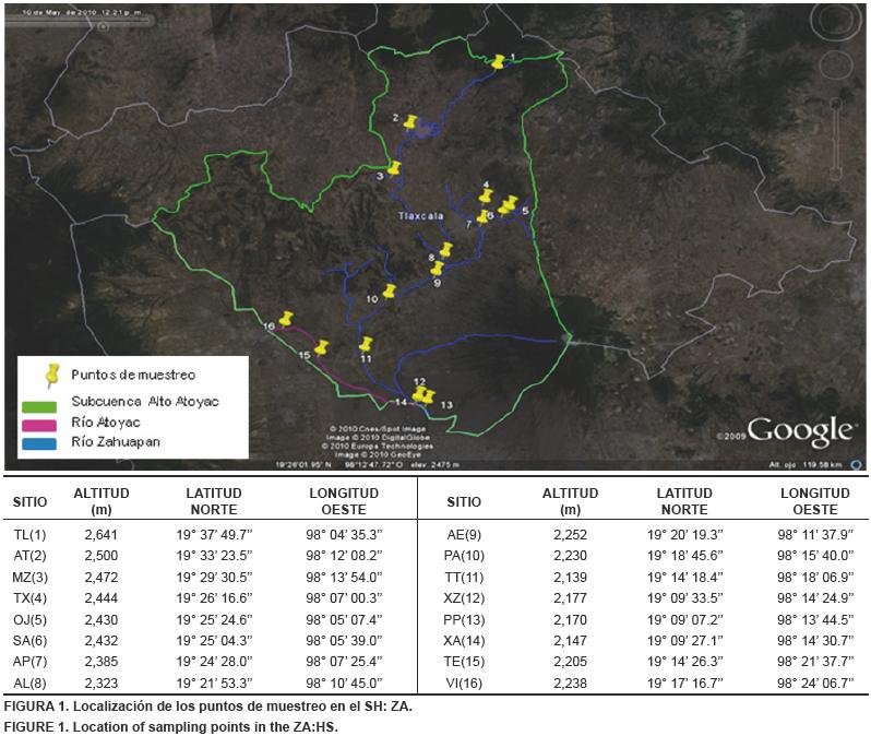 El estudio se realizó a lo largo del SH:ZA (Figura 1). Después de una etapa de inspección se eligieron los sitios de muestreo con base en la metodología de evaluación de riesgo a la salud propuesta por DíazBarriga (1999). Se consideraron las zonas de exposición humana y se tomaron en cuenta las descargas industriales, municipales y agrícolas; con la finalidad de intentar discernir la aportación de contaminantes inorgánicos provenientes de actividades antropogénicas. Se establecieron 16 estaciones de colecta denominadas: Tlaxco (TL), Laguna de Atlangatepec (AT), Muñoz (MZ), Texcalac (TX), El Ojito (OJ), Sambrano (Sa), Apizaco (AP), Atlihuetzia (AL), Apetatitlán (AE), Panotla (PA), Tetlatlahuca (TT), XicohtzincoZahuapan (XZ), Papalotla (PP), XicohtzincoAtoyac (XA), Tepetitla (TE) y Villa alta (VI). Tlaxco y El Ojito fueron consideradas como puntos de referencia; zonas aparentemente no impactadas por actividades humanas.