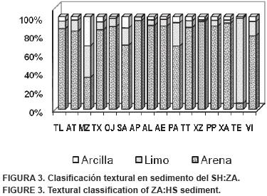 El 87.5 % de los sedimentos exhibieron un contenido de arena por arriba del 68 %. Estos resultados indican que la textura predominante es arenosa. Cabe resaltar dos claras excepciones, el sitio denominado Muñoz con clase textural franca; porcentajes equivalentes de arenaarcillalimo y el sedimento de Tepetitla que se clasifica como limosa con un porcentaje por arriba del 90 % de este grano (Figura 3).