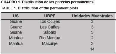 El estudio se realizó en plantaciones de Pinus caribaea Morelet var. caribaea Barret y Golfari, para lo cual se tomó el registro de unidades muestrales de área fija circular de 400 m2 (radio=11.28 m) de 14 parcelas permanentes establecidas en el año 2006, con cuatro mediciones consecutivas efectuadas y distribuidas en las diferentes Unidades Básicas de Producción Forestal (UBPF), como se indica en el Cuadro 1.