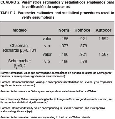 Como resultado del ajuste de los modelos con diferentes valores tentativos de β2 se obtuvieron como los mejores modelos Shumacher con una β2=0.2 y ChapmanRichards con una β2=0.101, a los cuales les correspondió el menor valor de la suma de cuadrados de los residuos o desviaciones (SCE).