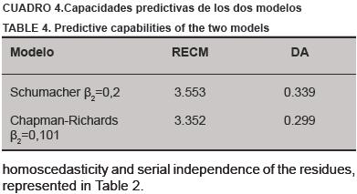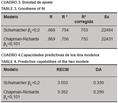 Comparando la bondad de ajuste (Cuadro 3) de cada una de las ecuaciones, el modelo de ChapmanRichards posee un mejor comportamiento del coeficiente de determinación (R2) y error de estimación.