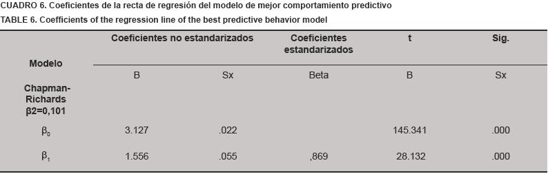 En el Cuadro 5 se presenta un resumen del análisis de varianza del modelo de mejor comportamiento predictivo de ChapmanRichards β2=0.101, el cual informa sobre una relación significativa entre las variables; el estadístico F contrasta la hipótesis nula de que el valor poblacional de R es cero, lo cual equivale a contrastar la hipótesis de que el valor de la pendiente de la recta de regresión vale cero; el nivel crítico (sig) indica que si se supone que el valor poblacional de R es cero, es improbable (probabilidad=0.00) que R, en esta muestra, tome valor 0.869; lo cual implica que R es mayor que cero y que, en consecuencia, ambas variables están linealmente relacionadas.