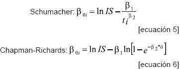 Estas dos ecuaciones describen una sigmoide, y han sido de las más utilizadas para la determinación de los índices de sitio y modelos de crecimiento (García, 1983; Báez, 1988; Peñalver, 1991; Padilla, 1999; Ferrere et al., 2001).