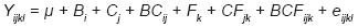 donde: Y..., es el valor observado del lésimo individuo en la késima familia, en la jésima condición de competencia y en el iésimo bloque; j es el valor promedio de la población; es el efecto del iésimo bloque; Cj es el efecto fijo de la jésima condición de competencia; BCij es el efecto de la interacción del iésimo bloque con la jésima condición de competencia; Fk es el efecto de la késima familia; CFjk es el efecto de interacción de la jésima condición de competencia con la késima familia; BCFijk es la interacción del iésimo bloque con la jésima condición de competencia y la késima familia y eijkl es el error dentro de parcela.
