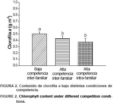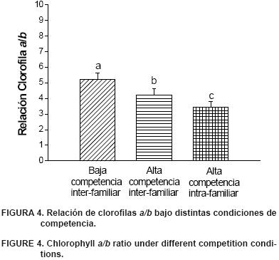 Fisiológicamente la plasticidad fotosintética se explica por la activación de los pigmentos accesorios cuando el funcionamiento de los pigmentos activos se ve disminuido, de tal forma que la combinación de ambos facilita la captación de luz y la capacidad fotosintética de la planta en condiciones difíciles. Así, la alta densidad se confirma como una situación de estrés con respecto a un mayor espaciamiento, ya que la baja competencia interfamiliar (condición I) presenta una relación a/b mayor que la alta competencia interfamiliar (condición II) y la alta competencia intrafamiliar (condición III). Del mismo modo, la condición III supone una condición de estrés mayor, ya que presenta una relación a/b menor que la condición II. Estudios que nos ayudan a entender la condición de competencia (III) intrafamiliar, pueden ser los estudios con clones de Eucalyptus (individuos genéticamente iguales), en los cuales se pudo determinar que bajo condiciones de alta densidad (estrés por reducción de espacio), las parcelas monoclonales son más sensibles que las parcelas de medios hermanos (competencia interfamiliar) en variables como la altura y el diámetro (Bouvet et al., 2005). Este tipo de estrés también es causante de una disminución en la cantidad de pigmentos de clorofila (Carter and Knapp, 2001). Por lo cual en nuestro estudio los individuos que se desarrollaron bajo la condición de competencia III, presentaron niveles de estrés superiores a las condiciones de competencia I y II.
