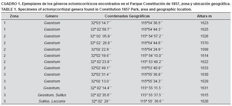 El conocimiento de los hongos ectomicorrícicos en México, y principalmente en Baja California, es limitado. Muchas zonas del estado no han sido suficientemente exploradas micológicamente; una de ellas es el Parque Nacional Constitución de 1857, a pesar de la importancia que estos organismos tienen para los ecosistemas forestales (Aguilar-Aguilar et al., 2009). En el presente trabajo se identificaron 25 ejemplares resultado de cuatro colectas realizadas en las diferentes zonas evaluadas del PNC1857 (Cuadro 1), siendo en el mes de agosto de 2007, cuando se colectó el 12 % de ejemplares de cuerpos fructíferos. Por otra parte, fue en los meses de febrero, agosto y mayo de 2008 cuando se encontró el mayor número de ejemplares (44, 36 y 8 %, respectivamente). El número de hongos colectados puede considerarse bajo, comparado con estudios realizados en otros sitios del país; por ejemplo, en un estudio realizado por Chávez-León et al. (2009) reportan la identificación de 52 hongos ectomicorrizógenos en el Parque Nacional Barranca del Cupatitzio, Michoacán, México, cifra muy por arriba de lo registrado en este estudio. Una posible explicación para el limitado número de hongos identificados pueden ser las características ambientales y edáficas presentes en el PNC 1857, las cuales podrían haber influido en la distribución y riqueza fúngica (estrés salino, heladas, prolongadas sequías) en las diferentes zonas evaluadas.