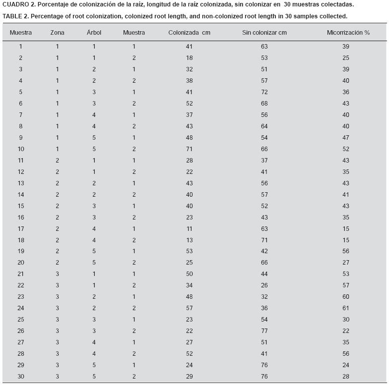 En cuanto a la micorrización de las raíces colectadas (Cuadro 2), se observó un incremento de acuerdo a la presencia de materia orgánica (Figura 5). Aquí la zona 3 mostró 37 % de micorrización en las raíces, seguida de las zonas 2 y 1 con 34 y 29 % respectivamente. Esto concuerda con las características propias de los hongos, los cuales son especies que necesitan cierta humedad para que sus hifas se dispersen por el suelo, condición que proporciona el acolchado de materia orgánica acumulada en el suelo (Pérez-Moreno y Read, 2004). Similares resultados han sido mencionados con anterioridad en plantas de Pinus palustris cuando son plantados en lugares con una cantidad adecuada de humedad, a diferencia de cuando se encuentran en estrés por falta de humedad (Valdez et al., 2006).