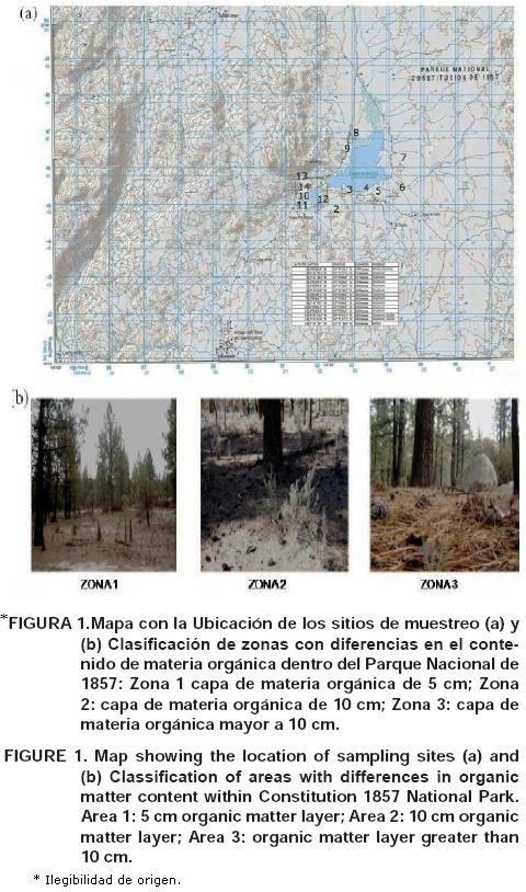 El muestreo de los cuerpos fructíferos y colecta de raíz de P. jeffreyi, se efectuó en verano e invierno de 2007 y 2008. Para tal fin se escogieron 14 sitios al azar en tres zonas diferentes del PNC 1857, considerando las características de vegetación y contenido de materia orgánica: zona 1 (capa orgánica 5 %); zona 2 (capa de materia orgánica 25 %) y zona 3 (capa de materia orgánica 50 % ). (Figura 1 a, b). En cada sitio se seleccionaron cinco árboles al azar de P.jeffreyi, ubicando el punto de goteo en relación a los límites de la copa del árbol. Una vez ubicado este punto, cerca de cada árbol, se realizaron dos excavaciones orientadas una al norte y otra al sur. La excavación se realizó en un cuadrante de 1 x 1 m y 20 cm de profundidad, del cual se extrajeron raíces secundarias de P.jeffreyi. Se colectaron un total de 30 muestras de raíz, las cuales se etiquetaron indicando la zona, el número de árbol, número de muestra y la fecha de colecta. Las raíces colectadas fueron lavadas con agua destilada estéril y conservadas en una solución de alcohol-formol-ácido acético (1:1:1), para su preservación y observación posterior al microscopio estereoscópico con la finalidad de identificar las estructuras ectomicorrícicas o morfotipos (Garza et al., 2002). Los ejemplares fueron trasladados al laboratorio de microbiología del Instituto de Ciencias Agrícolas de la UABC, para su posterior estudio. En el caso de cuerpos fructíferos de HE, los ejemplares colectados se identificaron mediante un análisis de las características estructurales macro y microscópicas basadas en el concepto de morfoespecie.