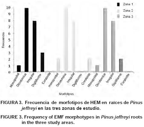 El estudio de los morfotipos de ectomicorrizas en raíces de P. jeffreyi en las tres zonas de estudio (Figura 3 y Figura 4), permitió identificar las siguientes distribuciones de los morfotipos al usar las claves DEEMY: morfotipo dicotómico, se encontró en todas las muestras analizadas; morfotipo irregular pinnado, se encontró en las muestras de ocho sitios de cada una de las zonas evaluadas, lo que hace a este morfotipo el segundo más frecuente asociado con P. jeffreyi dentro del PNC 1857; seguido por el morfotipo monopodial pinnado, que se encontró en una baja frecuencia en las tres zonas; y el morfotipo digitiforme (Cenococcum geophilum), que se encontró en las muestras de dos zonas únicamente, zonas 1-2 y 1-3 respectivamente; y el morfotipo coraloide, que se identificó en muestras de la zona 2.