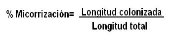 Para la identificación de la asociación ectomicorrícica se colectaron raíces de cinco muestras de árboles de cada zona de estudios. Posteriormente, se seleccionaron raíces secundarias usando pinzas de disección de punta fina y colocándolas en una caja petri previamente dividida en cuadrículas de 1 cm2. Consecutivamente, las estructuras ectomicorrícicas fueron identificadas bajo el estereoscopio usando lentes de aumento 20X y 40X. Las estructuras ectomicorrícicas se apreciaron como un cambio en el desarrollo radicular, "deformación". Para la identificación de los morfotipos se emplearon claves establecidas; en este caso se utilizaron las publicadas en el sistema de Información para la caracterización y determinación de ectomicorrizas (Agerer y Rambold, 2004). La presencia de estructuras ectomicorrícicas se determinó mediante el método de intersección de cuadrantes, y el porcentaje de raíz colonizada se calculó contando las raíces colonizadas y sin colonizar mediante la fórmula propuesta por Jha et al. (2008):