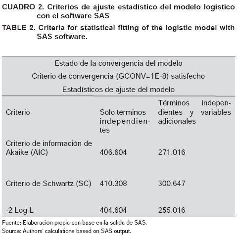 El mensaje de estado de la convergencia del modelo indica que la solución numérica convergió junto con los criterios de Akaike y Schwartz (Cuadro 2). En tanto -2Log L es usado para la prueba de la relación de verosimilitud (Likelihood Ratio Test).
