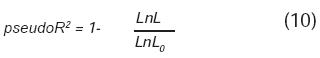 Sustituyendo los datos en (10), se obtuvo la pseudo R2 = 0.3697 ≈ 0.37. Por lo tanto el modelo fue aceptable, ya que un ajuste por arriba de 0.1 es satisfactorio (Bateman citado por Valdivia et al., 2009).