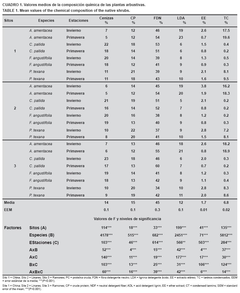 Los arbustos nativos Acacia amentacea Benth. (Leguinosae), Celtis pallida Torr. (Ulmaceae), Forestiera angustifolia Torr. (Oleaceae) y Parkinsonia texana I. M. Johnst. (Leguminosae), que crecen en el Matorral Tamulipeco Espinoso, son importantes fuentes de alimento para el venado cola blanca (Ramírez-Lozano, 2004). Asimismo, proveen madera de alta calidad para formar cercos y para construcción y son ampliamente distribuidos, junto con otras especies, formando conglomerados (Everitt et al., 2002). Sin embargo, cuando se emplean como alimentos, son afectados por varios factores que influyen sobre parámetros como su composición química y digestibilidad cuando se consideran los efectos de espacio (sitios), condiciones ambientales (estacionalidad) y compuestos secundarios de las plantas (TC). Por tanto, este estudio se realizó con el objetivo de determinar y comparar estacionalmente la composición química y los parámetros de producción de gas in vitro en cuatro arbustos nativos tratados con y sin PEG.