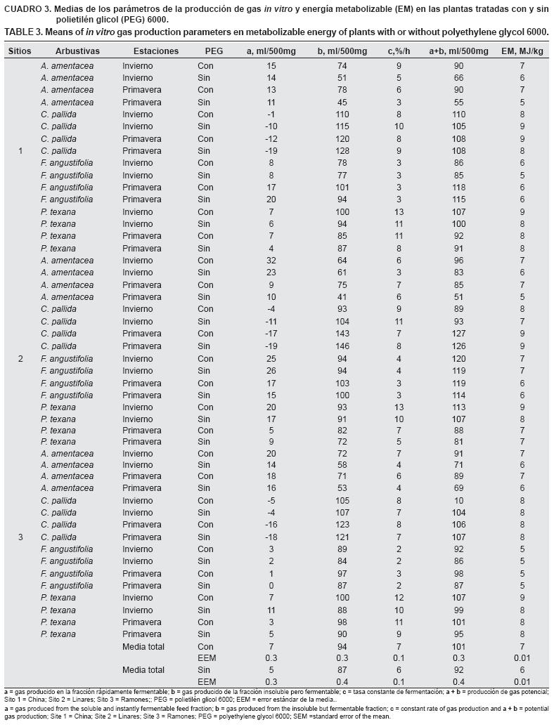 Los datos de composición química, producción de gas in vitro y de EM, con y sin la adición de PEG, se analizaron estadísticamente mediante un diseño completamente al azar con un arreglo trifactorial incluyendo los efectos de los tres sitios (Ramones, Linares y China), especies arbustivas (A. amentacea, C. pallida, F. angustifolia y P. texana) y estaciones del año (invierno y primavera) y las dobles y triple interacciones (Montgomery, 2004). Se empleó la prueba de t para comparar los parámetros de fermentación a, b, c, a+b y EM de las plantas tratadas con y sin PEG. Asimismo, se realizaron análisis de correlación Pearson entre la composición química y los parámetros de producción de gas in vitro y EM con y sin PEG. Todos los análisis estadísticos se realizaron con el paquete computa-cional SPSS de Windows versión 13 (SPSS, 2004).