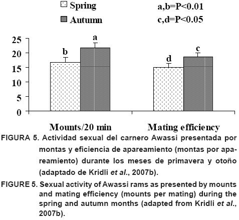 Las ovejas Awassi son reproductoras temporales, teniendo una amplia temporada de reproducción. Dicha temporada para las ovejas Awassi comienza entre mediados de junio y julio (Epstein, 1982) con partos durante el otoño y el invierno. En la mayoría de los sistemas de producción, los carneros conviven durante todo el año con las ovejas. Los carneros son fértiles durante todo el año (Tabbaa et al., 2006) pero demuestran mayor actividad sexual durante el verano y el otoño que durante la primavera (Figura 5; Kridli et al., 2007b). Bajo condiciones naturales, la temporada de reproducción de la oveja Awassi ocurre durante el verano y el otoño, así las ovejas sólo pueden parir una vez al año (Rottensten y Ampy, 1971; Epstein, 1982 y 1985). La temporada de apareamiento de las ovejas es a Anales de junio hasta principios de septiembre para parir entre Anales de noviembre a principios de febrero (Zarkawi, 1997; Thomson et al., 2003). A pesar de estos datos, se reporta que la oveja Awassi puede parir durante todo el año. Hamadeh et al.(1996) indicó el potencial del incremento intensivo de las ovejas Awassi para parir en intervalos de 6 meses.