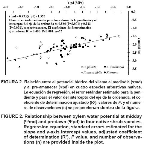 Se encontró una relación lineal (P<0.001) y positiva entre el Ψmd y el Ψpd (pendiente = 0.433, Figura 2). Esto podría significar que un aumento en el Ψpd de -1.0 MPa inducirá un incremento de 0.433 MPa en el Ψmd. De acuerdo a los estadísticos de mínimos cuadrados, el Ψpd explicó alrededor del 45 % de la variabilidad estacional total en el Ψmd. Para las cuatro especies de plantas arbustivas, los valores del coeficiente de correlación de Spearman (P<0.01) entre el Ψpd y el Ψmd fueron de 0.596, 0.626, 0.607 y 0.628 para C. pallida, A. amentacea, F. angustifolia y P. texana, respectivamente.