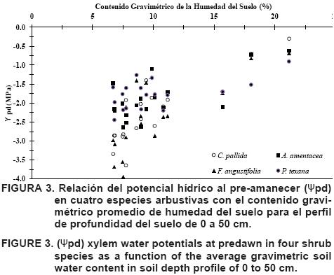 Diferencias significativas (P<0.05) fueron detectados en el Ψmd entre las especies arbustivas en sólo siete fechas de muestreo (Cuadro 4). En la fecha de mues-treo más húmeda (septiembre 28), cuando el Ymd fue el más alto y cuando el contenido de agua del suelo en la capa de suelo 0-50 cm fue superior al 20 % (Cuadro 2), los valores en el Ψmd en las especies estudiadas tuvieron un promedio de -1.54 MPa; en cambio, en la fecha de muestreo más seca (julio 13), cuando el contenido de agua en el suelo promedio fue de 7 %, las especies C. pallida, A. amentacea y P. texana mostraron los potenciales hídricos más altos al mediodía (-2.10 MPa) con respecto a F. angustifolia, la cual alcanzó un mínimo de -3.38 MPa (Cuadro 4). Parece ser que P. texana y A. amentacea son ejemplos de especies arbustivas que se han adaptado a la baja disponibilidad de agua del suelo, ya que tienden a mantener una hidratación de los tejidos, mientras que la adaptación de C. pallida y F. angustifolia con el medio seco parece depender de las estrategias que les permitan hacer frente a la desecación interna y, en consecuencia, presentan valores más bajos en los potenciales hídricos (Gebrekirstos et al., 2006).