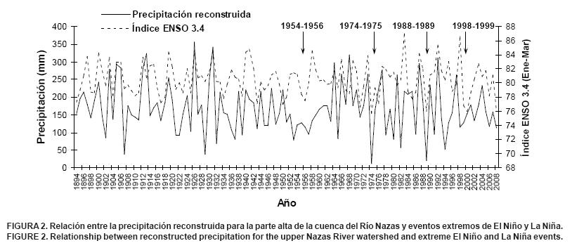 La precipitación reconstruida para la parte alta de la cuenca del Río Nazas y el índice ENSO 3.4 (enero-marzo), estimativo de la variabilidad del ENSO para los últimos 115 años (1894-2008), muestran una buena relación (Figura 2).
