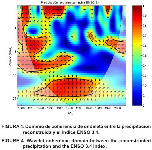 El análisis espectral de coherencia de ondeletas, para las variables precipitación reconstruida e índices del ENSO 3.4 en los últimos 100 años (1900-2000), indicó que durante el período de 1900-1950, el ENSO influyó de forma significativa (P<0.05) sobre la variabilidad de la precipitación a frecuencias de 1 a 14 años y de 1986-2000 a frecuencias en los rangos de 1 a 2 y de 6 a 8 años.