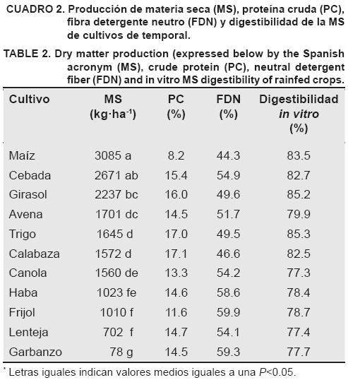 Tecnología 4. Diversificación de cultivos tradicionales. Se probaron ocho especies para forraje: haba, garbanzo, lenteja, canola, girasol, calabaza, cebada y trigo, y como testigos frijol, maíz y avena. Se comparó la producción de materia seca (MS), proteína cruda (PC), fibra detergente neutro (FDN) y digestibilidad in vitro de la materia seca (DIVMS) (Goering and Van Soest, 1970; Bremner, 1996).