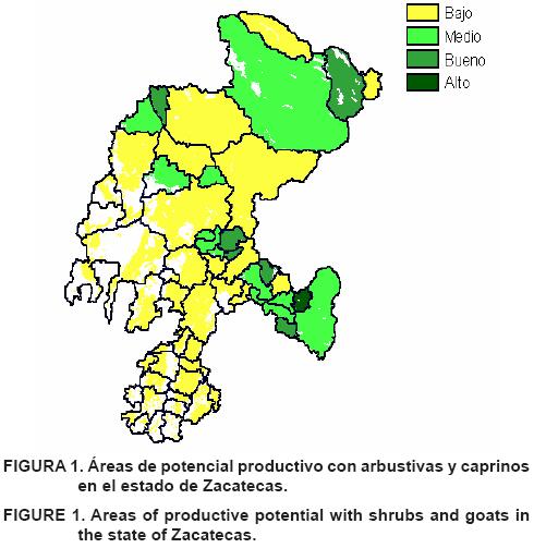 3.1 Información secundaria. De acuerdo con Salinas (1995), en el norte centro de México existen los tres sistemas de producción caprinos: i) producción de leche y cabrito, ii) producción de carne de adultos, y iii) producción de cabrito. Los residuos de cultivos son importantes para la actividad caprina por desarrollarse alrededor de áreas agrícolas de temporal y riego. Ya que la cabra presenta una preferencia por consumo de arbustivas (Mellado et al., 2005), se delimitaron áreas con arbustivas como las más apropiadas para el desarrollo de cabras (Figura 1).