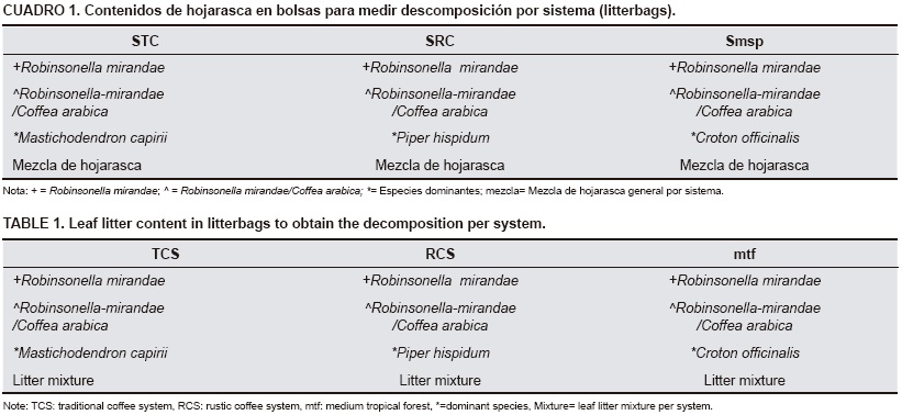 Se establecieron tres cuadrantes (100 m2) representativos para cada uno de los siguientes sistemas agroforestales: 1) Sistema Tradicional de Café (STC), 2) Sistema Rústico de Café (SRC) y 3) Sistemas de selva mediana subperennifolia (Smsp). En cada sitio se colocaron aleatoriamente tres trampas de red de polietileno (abertura de 1 cm) con forma de embudo para colecta de hojarasca (1 m2). Las trampas se colocaron a una altura aproximada de 50 cm del suelo, para evitar daños por microorganismos o por humedad al permitir un flujo mayor de aire (Swift et al., 1979).