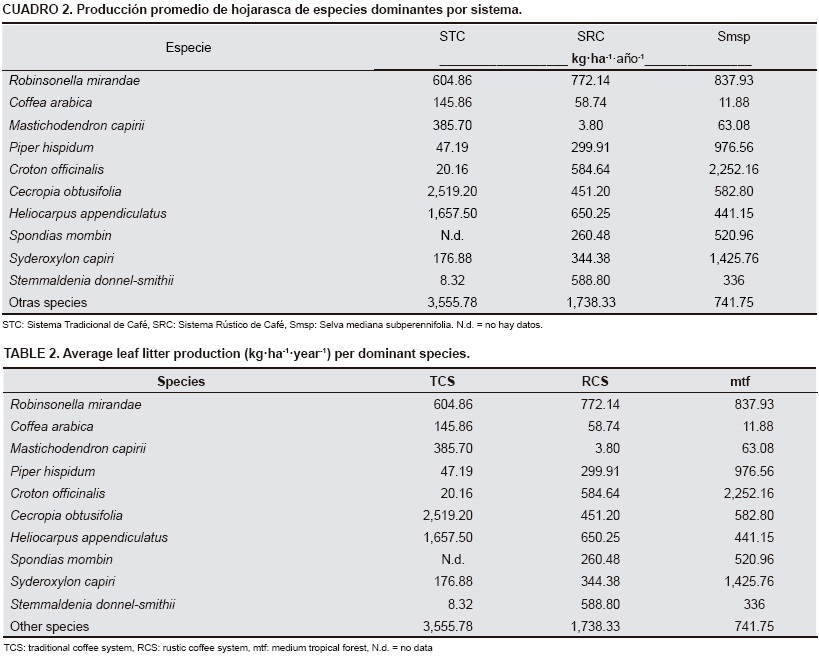 El peso promedio total de hojarasca recogida en el STC fue 9,121.50 kg·ha1·año1. Las especies dominantes fueron Cecropia obtusifolia (27.6 %), Heliocarpus appendiculatus (18.2 %) y R. mirandae (14.1 %). El total de hojarasca colectada en el SRC fue 5,752.7 kg·ha1·año1, y las especies con mayor producción fueron R. mirandae (14.3 %), H. appendiculatus (13.5 %), Stemmaldenia donellsmithii y Croton officinalis (11.3 %). El total de hojarasca colectada en Smsp fue 8,190 kg·ha1·año1, con C. officinalis (27.5 %), Syderoxylon capiri (17.4 %), P. hispidum (1.9 %) y R. mirandae (10.2 %) como principales especies productoras (Cuadro 2). C. arabica tuvo un pequeño aporte de hojarasca en el STC y SRC, similar al encontrado por Beer (1988).