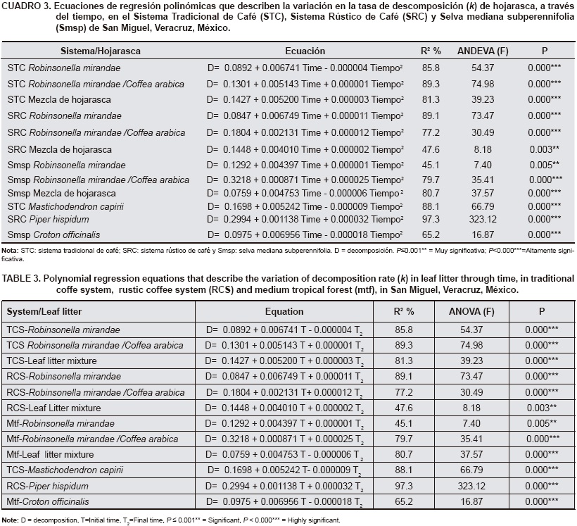 El ANDEVA mostró que las tasas de descomposición de la hojarasca no variaron significativamente entre las repeticiones de cada sistema, pero sí entre la hojarasca, los sistemas y el tiempo de muestreo. Todas las ecuaciones polinomiales de regresión fueron altamente significativas (P < 0.01) (Cuadro 3). La interacción fue significativa entre el tiempo y tipo de hojarasca por sistema. Esto implica que los cambios en k a través del tiempo no fueron exactamente iguales en los sistemas, sino que varían con respecto a las diferencias de los mismos (Figura 3).