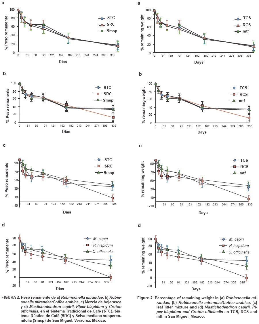En todos los sistemas, el peso seco restante varió en el siguiente orden de magnitud: R. mirandae > R. mirandae/C. arabica > Mezcla de hojarasca > Especies dominantes (P. hispidum > C. officinalis > M. capirii). La pérdida inicial de peso relativo varió significativamente entre las mezclas de especies y sistemas, pero no entre repeticiones. Cecropia obtusifolia y otras especies como Dipholis minutiflora, Cordia alliodora, Malinkara zapota y M. capirii, tienen hojas grandes y desarrollan una cutícula cerosa y gruesa que puede resistir a la descomposición. Por su parte, otras especies como Inga spp., tienen un ritmo más rápido de descomposición debido a que carecen o tienen capas menores de cutícula que las especies mencionadas.
