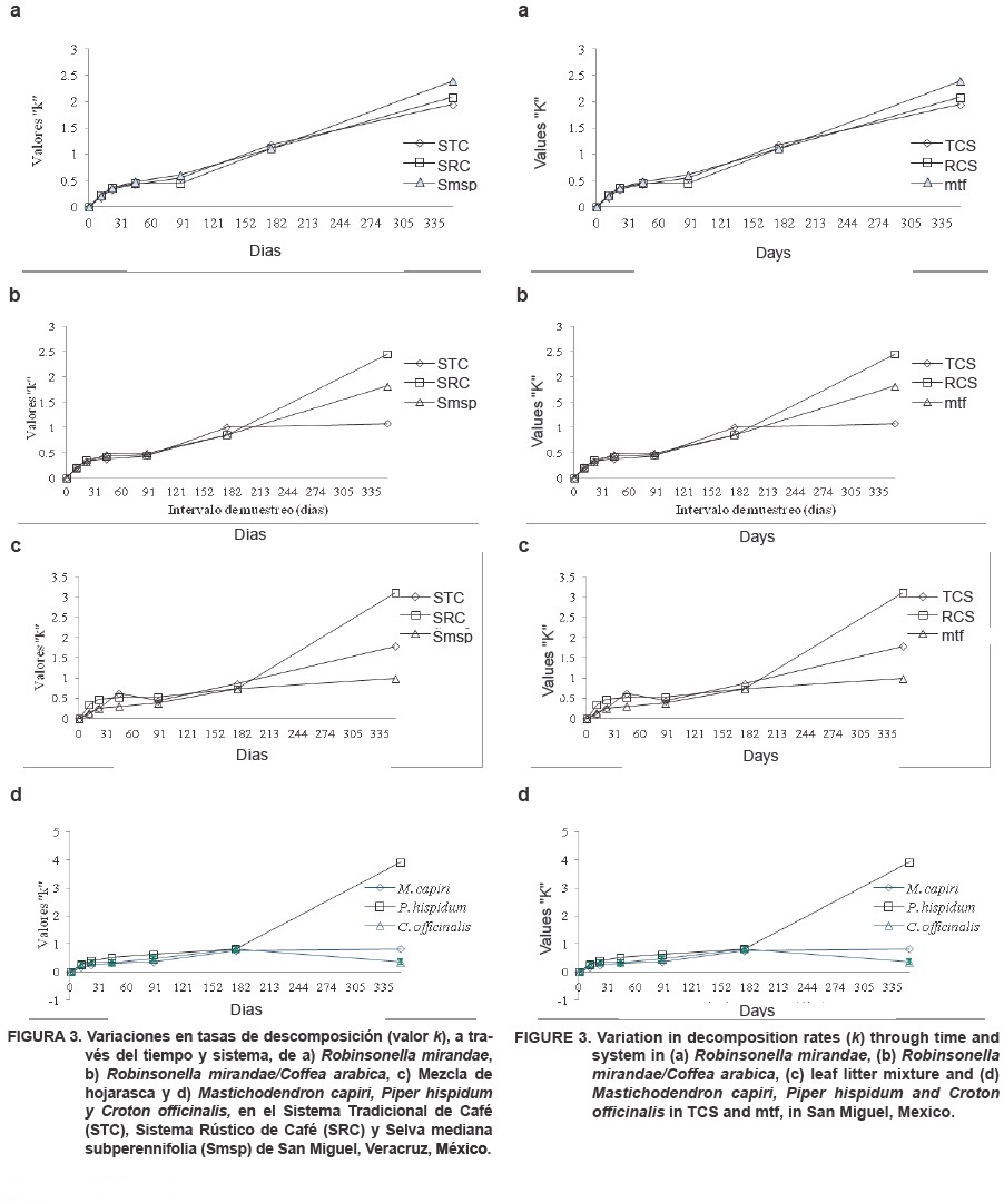 Los cambios en k de las hojarascas no siguieron la misma tendencia en todos los sistemas (Figura 3). La mayoría de las curvas de R. mirandae en el STC y Smsp; R. mirandae/C. arabica en el STC, SRC y Smsp; la Mezcla de hojarasca en el STC y SRC; y las de P. hispidum, mostraron un incremento rápido, seguido por una disminución en la descomposición a través del tiempo. En cambio, las curvas de R. mirandae en el SRC, la Mezcla de hojarasca en Smsp, y M. capirii fueron asintóticas, lo que prueba que no hubo mayor incremento en k, después de 200 días. En la hojarasca de C. officinalis (hojarasca de baja calidad), k se incrementó en un inicio, para disminuir rápidamente después de 200 días; la curva presentó forma de cúpula. Las formas diferentes en las curvas y los valores desiguales en los coeficientes de regresión, indicaron los diferentes cambios en k de la hojarasca para cada sistema.