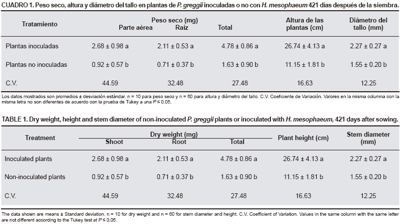 La altura y el diámetro del tallo se midieron en 60 plantas. Se tomaron al azar 10 plantas inoculadas con H. mesophaeum y 10 plantas sin inocular para determinar el peso seco de la raíz y el de la parte aérea; las muestras se secaron a 70 °C por 48 h, hasta peso constante. Las mediciones se realizaron a los 421 días después de la siembra.
