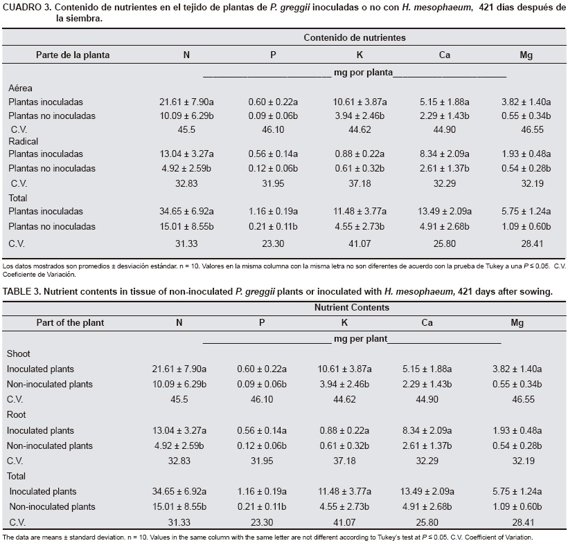 Las plantas inoculadas presentaron incrementos conspicuos en biomasa de parte aérea, raíz y contenido de N, P, K, Ca y Mg, respecto a las plantas no inoculadas. H. mesophaeum fue particularmente eficiente en la movilización de P y Mg a la parte aérea de las plantas de P. greggii. Un alto porcentaje de colonización por H. mesophaeum, se observó principalmente en la parte central del cepellón. La formación de esporomas del hongo, 392 días después de la inoculación, también fue observada. Debido a los porcentajes altos de micorrización y al efecto benéfico registrado, se considera que el hongo comestible ectomicorrízico H. mesophaeum tiene potencial para su utilización en programas de inoculación de P. greggii en invernadero.