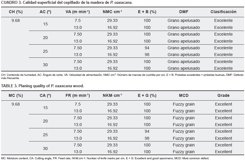 En general, la trabajabilidad de la madera de P oaxacana se clasificó como excelente, con excepción del moldurado en el corte preliminar, donde fue clasificado como bueno; éste pudo mejorar con un segundo corte.