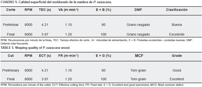 En el Cuadro 5 se muestra la calidad superficial del moldurado. En el corte preliminar fue clasificada como buena; el defecto más frecuente fue el grano rasgado. Éste se manifestó con intensidad mayor en 20 % de las probetas trabajadas al momento de realizar el cambio del corte transversal a longitudinal. Lo anterior se puede atribuir a la densidad moderadamente liviana de la especie, donde la flexibilidad y la capacidad de adhesión entre Abras es menor, ocasionando que en lugar de cortar se produzca un desprendimiento de grandes astillas. Asimismo, se observó que al realizar el moldurado en el sentido longitudinal y diagonal al hilo de la madera; la presencia y severidad de los defectos es nula, por tanto, la calidad aumenta logrando mejores resultados. Sin embargo, en el corte final se obtuvieron resultados excelentes, debido a que se contrarrestó el defecto de astillado en el cambio de corte ya mencionado. Esta modificación aumentó considerablemente la calidad de las piezas trabajadas, ya que en la mayoría de las probetas se eliminó por completo el defecto. Sin embargo, el grano rasgado siguió presentándose de manera muy superficial sin afectar la calidad del moldurado en el corte transversal de la pieza (Cuadro 5). El resultado obtenido no coincide con el de Borjade la Rosa y Tamarit (1997) en P. arizonica, ya que reportan este ensayo como regular; ni con Cruz y Borja (1995) en P. cooperi, quienes lo clasifican como un moldurado pobre. Por otra parte coincide con Martínez y MartínezPinillos (1996) en P. patula, P. pseudostrobus y P. teocote, y con Malkoçoğlu y Özdemir (2005) en P. sylvestris.