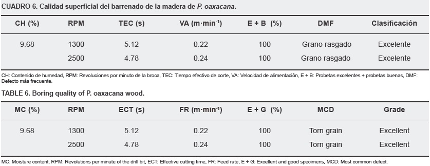 En el Cuadro 6 se presentan los resultados del barrenado, los cuales indican que la calidad fue excelente. El defecto más frecuente fue el grano rasgado (Figura 5), el cual no influyó en la calidad de la superficie trabajada. Este resultado se puede atribuir a la gran cantidad de madera temprana presente en la probeta.