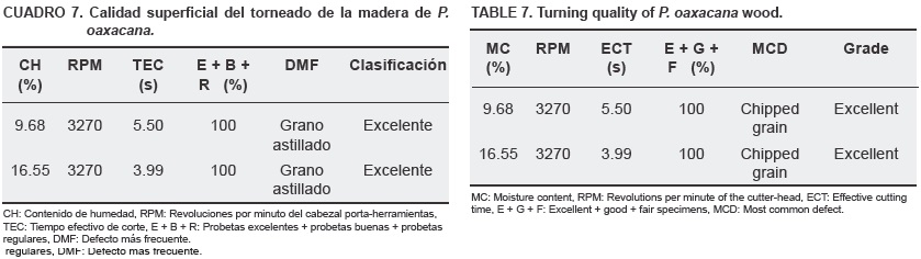 Los resultados del torneado se muestran en el cuadro 7. El contenido de humedad no mostró un efecto determinante en la calidad de la superficie, ya que para ambos contenidos (9.7 y 13.13 %), las probetas presentaron una calidad de mínima a regular. La suma de las probetas excelentes, buenas y regulares, dio como resultado una clasificación excelente.