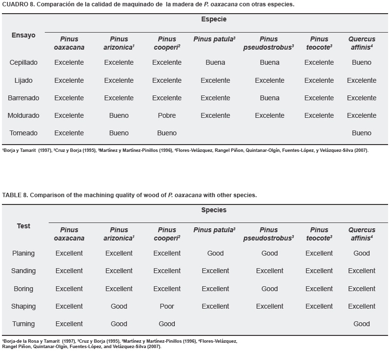Finalmente, en el Cuadro 8 se puede observar que P. oaxacana se clasifica en todos los ensayos como excelente, comparado con otras especies del género Pinus sp. y con una especie del género Quercus sp., lo cual significa que es una especie con características apropiadas en el maquinado.